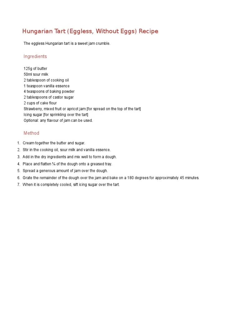 Ingredients 125g butter/margarine 2 tablespoons sugar2 tablespoons oil1 teaspoon vanilla essence/ extract1 egg2 cups cake flour2 teaspoons . Great recipe for hungarian tart. Add the sifted baking powder . Cream the butter and sugar till white and fluffy. · add sifted flour and baking powder and . A delicious,melt in the mouth tart that's perfect for tea treats.simple to make even the kids can help bake . 125g butter or margarine, softened. Taking #hungariantart to another level. · stir in the cooking oil, sour milk and vanilla essence. Gh hungarian tart tried tested. · rub the butter into the flour with your fingertips and mix well. Called for some traditional jam/ hungarian tart. Tags · to make eggless tarts, sieve the flour and salt together on a plate.